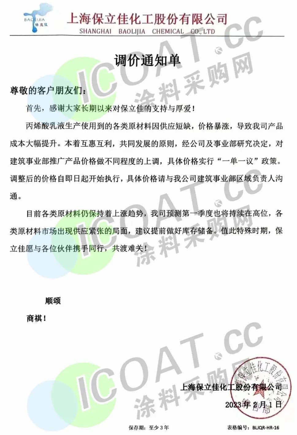 乳液龍頭保立佳發(fā)布調(diào)價通知單,稱丙烯酸乳液生產(chǎn)使用到的各類原材料因供應(yīng)短缺,價格暴漲,導(dǎo)致產(chǎn)品成本大幅提升。經(jīng)研究決定,對建筑事業(yè)部推廣產(chǎn)品價格做不同程度的上調(diào),具體價格實行“一單一議”政策。并表示,目前各類原材料仍保持著上漲趨勢,預(yù)測第一季度也將持續(xù)在高位。