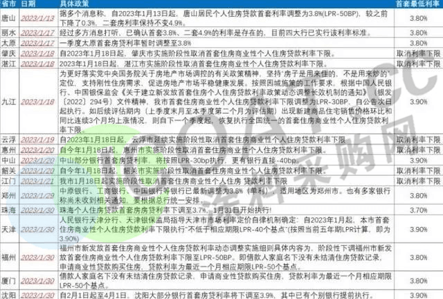 2023年新調整利率下限的城市接近20個,包括鄭州、天津、福州、沈陽、廈門等二線城市,肇慶、湛江、云浮、惠州、韶關、江門階段性取消首套房貸利率下限。其中,唐山、太原首套房貸利率最低可至3.8%,九江降至4.0%,中山可低至3.9%。