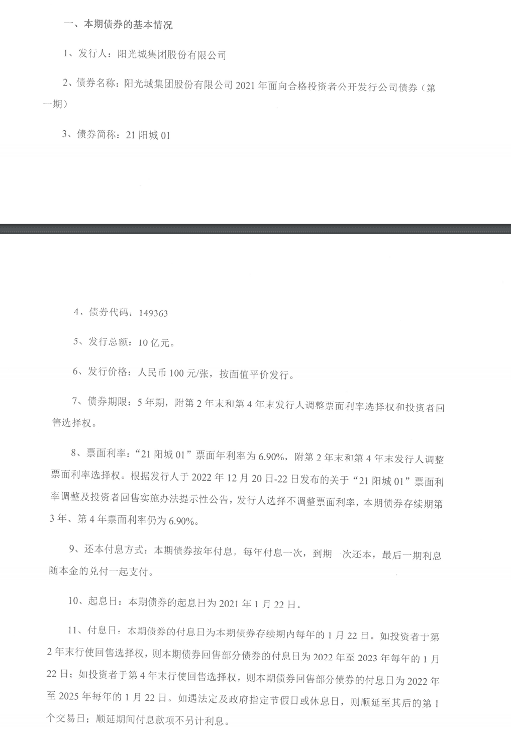 公告顯示,“21陽城01”將轉換成新債券“H1陽城01”,擬作為特定債券轉讓起始日為2023年2月3日,債券期限為5年期,第二年末和第四年末附發行人調整票面利率選擇權和投資者回售選擇權。
