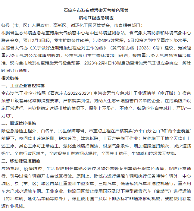 石家莊市重污染天氣應急指揮部批準,自2023年2月4日18時啟動重污染天氣Ⅱ級應急響應,解除時間另行通知。