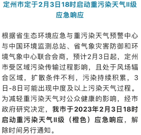 定州市定于2月3日18時啟動重污染天氣Ⅱ級(橙色)應急響應。解除時間另行通知。