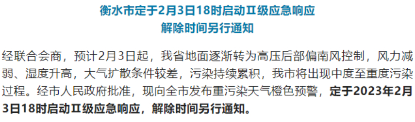 衡水市定于2月3日18時啟動II級應急響應,解除時間另行通知。