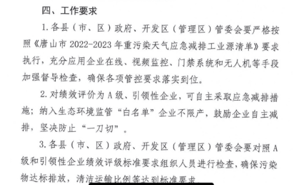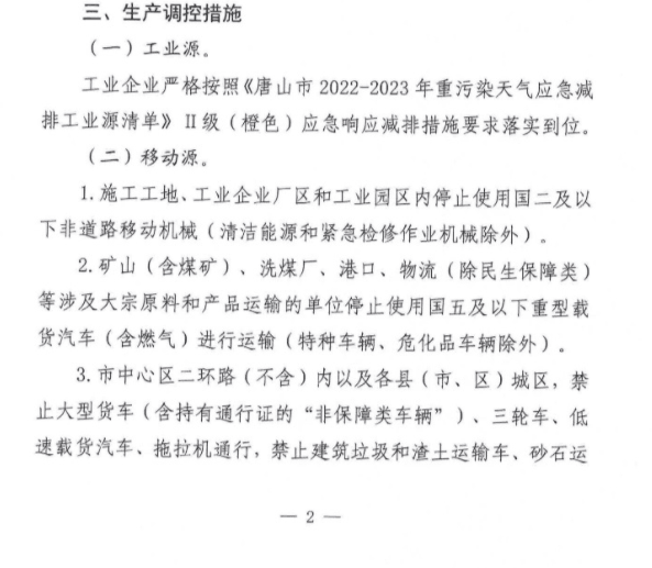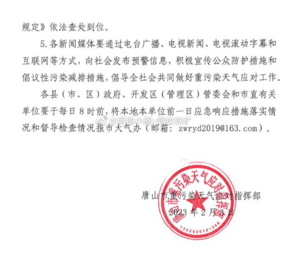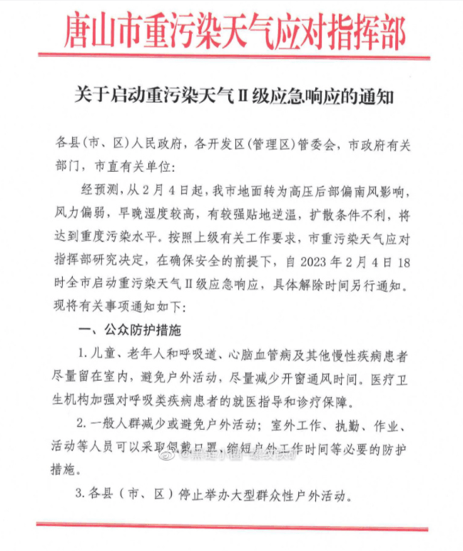 唐山市自2023年2月4日18時全市啟動重污染天氣Ⅱ級應急響應,具體解除時間另行通知。