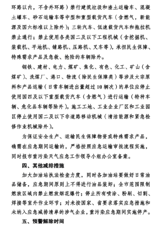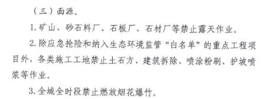 礦山、砂石料廠、石板廠、石材廠等禁止露天作業;除應急搶險和納入生態環境監管“白名單”的重點工程項目外,各類施工工地禁止土石方、建筑拆除、噴涂粉刷、護坡噴漿等作業;全域全時段禁止燃放煙花爆竹。
