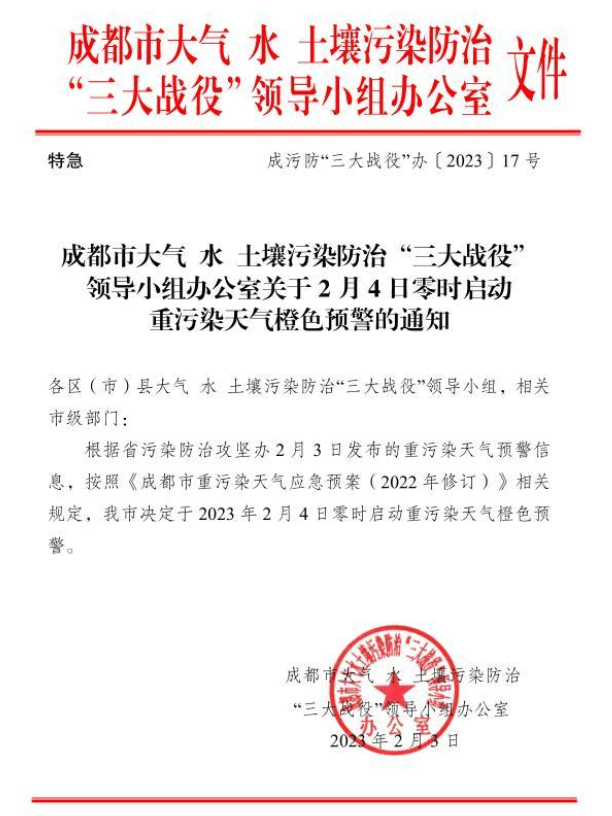 成都市大氣、水、土壤污染防治“三大戰役”領導小組辦公室發布通知,根據四川省污染防治攻堅辦發布的重污染天氣預警信息,按照《成都市重污染天氣應急預案(2022年修訂)》相關規定,成都決定于2023年2月4日零時啟動重污染天氣橙色預警。