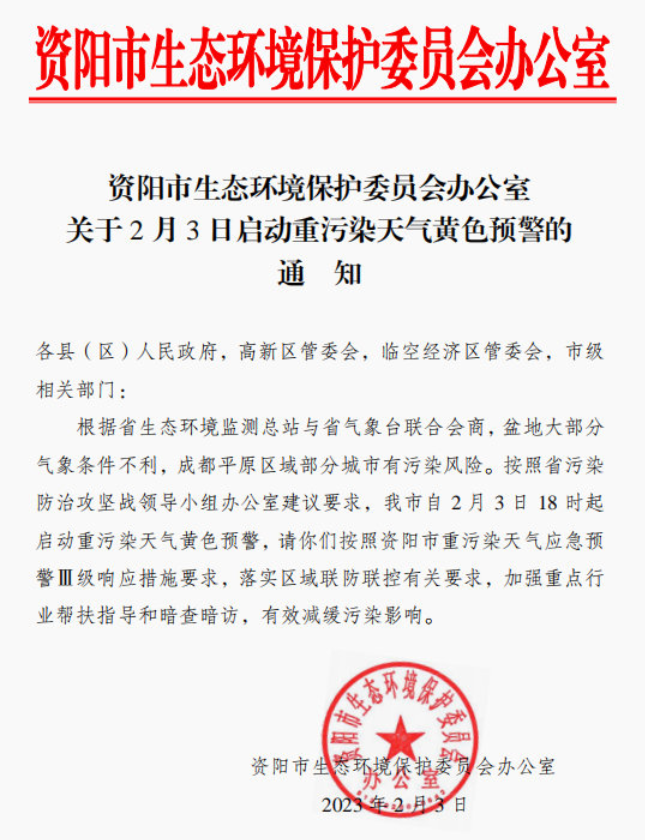 資陽市自2月3日18時起啟動重污染天氣黃色預警,請你們按照資陽市重污染天氣應急預警M級響應措施要求,落實區域聯防聯控有關要求,加強重點行業幫扶指導和暗查暗訪,有效減緩污染影響。
