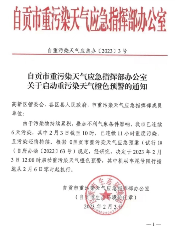 自貢市自2月3日12時啟動重污染天氣橙色預警,自2月6日零時起,執行機動車尾號限行措施。重污染天氣橙色預警的啟動,也將代表新一輪汽車尾號限行的實施,請各位私家車主請注意自己的車輛號牌尾號喲,合理安排、綠色出行。