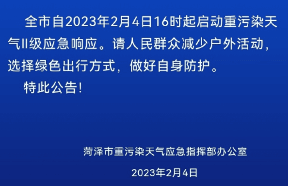 菏澤市重污染天氣應急指揮部辦公室通知全市自2023年2月4日16時起啟動重污染天氣Ⅱ級應急響應。