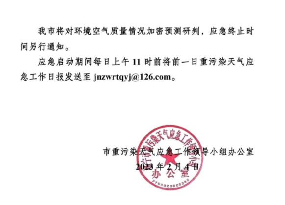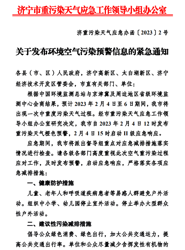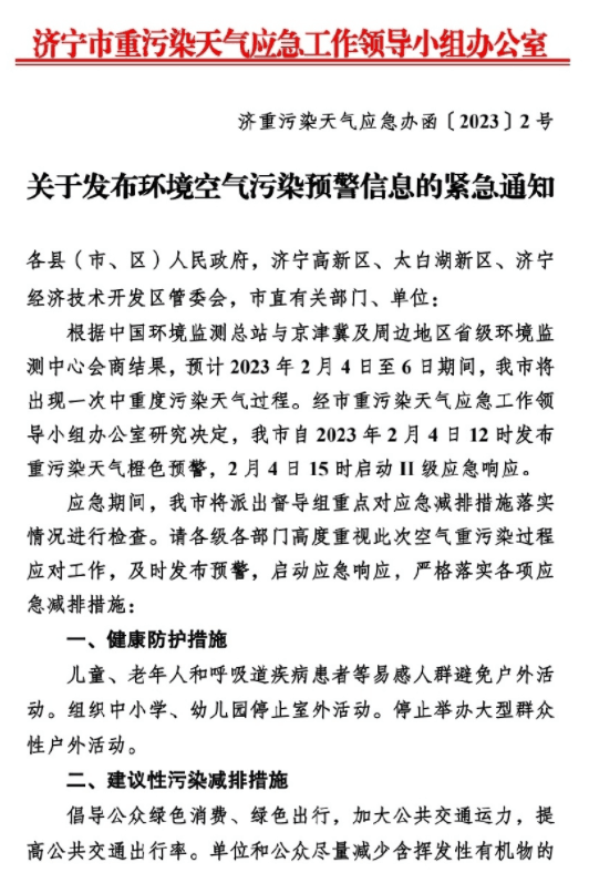 濟寧市重污染天氣應急工作領導小組辦公室研究決定,自2023年2月4日12時發布重污染天氣橙色預警,2月4日15時啟動II級應急響應。