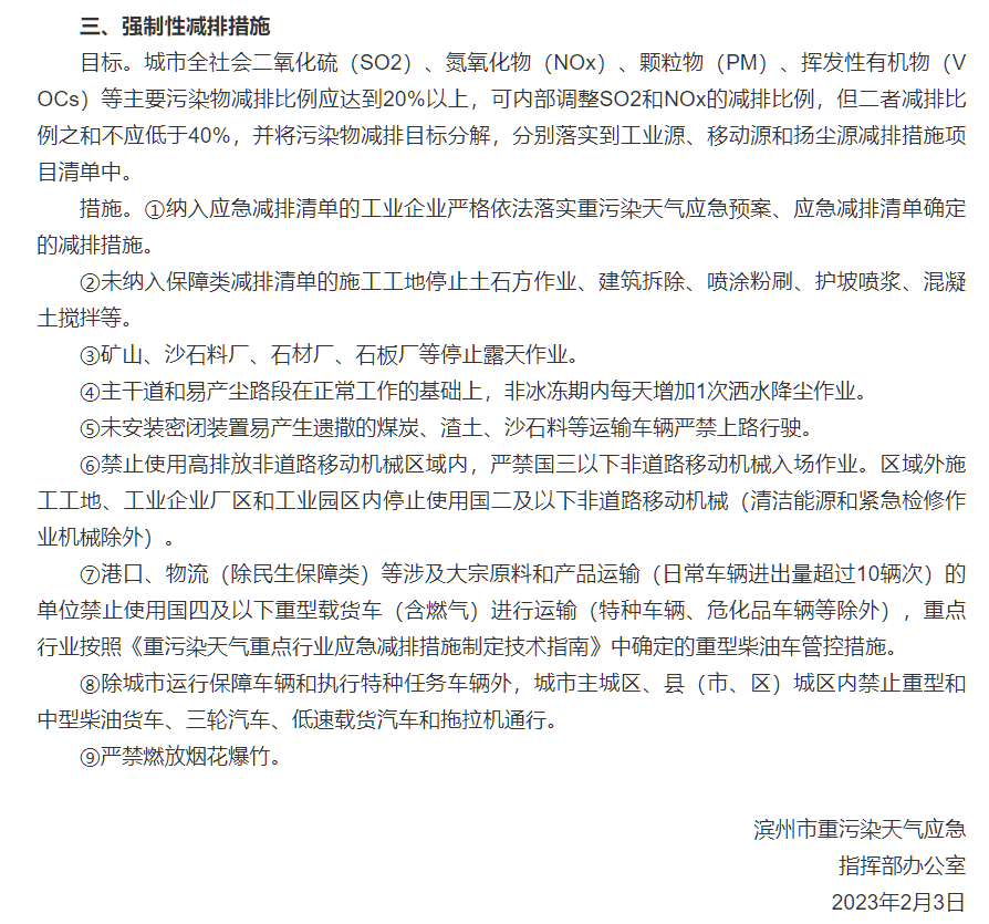 濱州市重污染天氣應急指揮部辦公室要求,于2月3日23時發布重污染天氣橙色預警,并于2月4日16時啟動Ⅱ級應急響應。