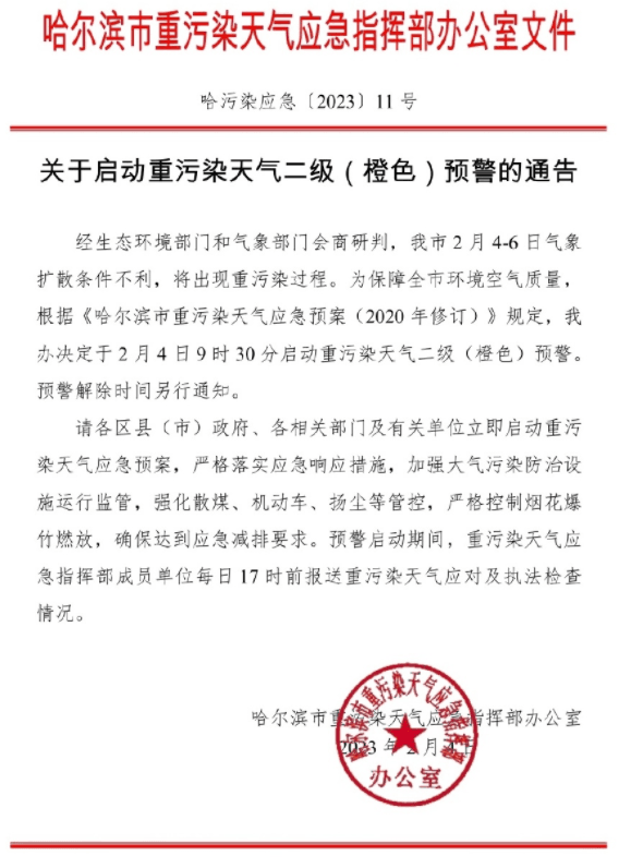 為保障全市環境空氣質量,根據《哈爾濱市重污染天氣應急預案(2020年修訂)》規定,哈爾濱市重污染天氣應急指揮部辦公室決定于2月4日9時30分啟動重污染天氣二級(橙色)預警,預警解除時間另行通知。