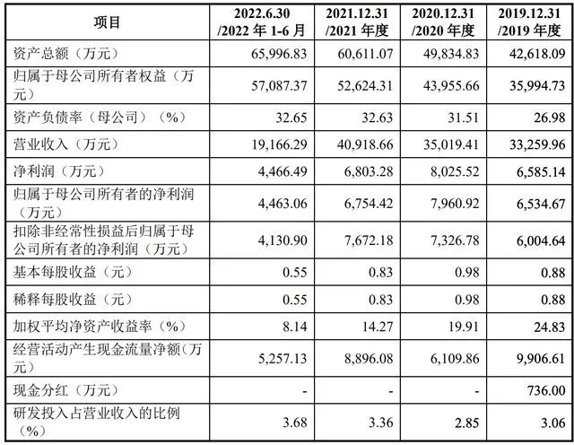 2019年、2020年、2021年和2022年上半年,凌瑋科技的營(yíng)收分別為3.33億元、3.50億元、4.09億元和1.92億元;凈利潤(rùn)分別為6585.14萬(wàn)元、8025.52萬(wàn)元、6803.28萬(wàn)元和4466.49萬(wàn)元,扣非后凈利潤(rùn)分別為6004.64萬(wàn)元、7326.78萬(wàn)元、7672.18萬(wàn)元和4130.90萬(wàn)元。