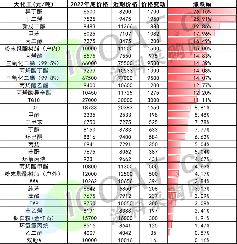 而在龍頭企業(yè)的“狂飆”節(jié)奏之下,30多種原材料年內(nèi)出現(xiàn)上漲趨勢。涂料產(chǎn)業(yè)鏈上游的異丁醛、新戊二醇、聚酯樹脂、TGIC等也出現(xiàn)了不同幅度的價(jià)格上漲。