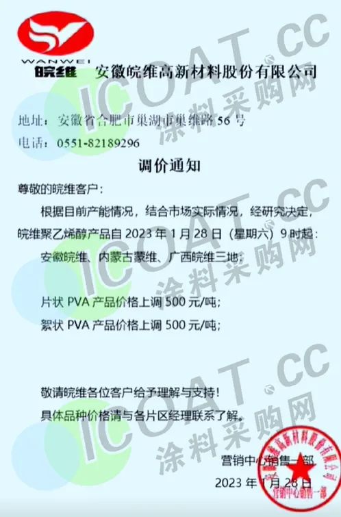 安徽皖維高新材料表示,安徽皖維、內(nèi)蒙古蒙維、廣西皖維三地,片狀、絮狀PVA價(jià)格上調(diào)500元/噸。