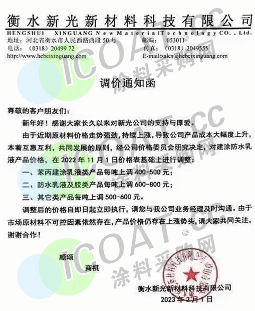 衡水新光:苯丙建涂乳液類上調(diào)400-500元/噸,防水乳液及膠類上調(diào)600-800元/噸,其它類上調(diào)500-600元/噸。