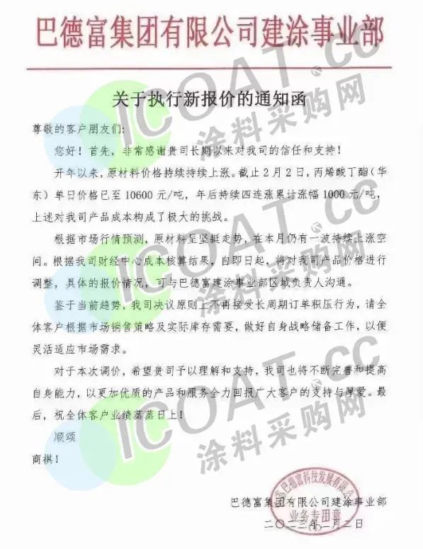 巴德富:自即日起,將對(duì)產(chǎn)品價(jià)格進(jìn)行調(diào)整,決議原則上不再接受長(zhǎng)周期訂單積壓行為。