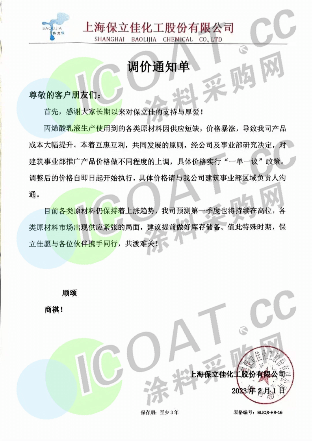 安徽科邦樹脂:乳液價(jià)格在原有基礎(chǔ)上做調(diào)整,苯丙內(nèi)外墻產(chǎn)品上調(diào)400-600元/噸,防水產(chǎn)品上調(diào)600-800元/噸,其他產(chǎn)品上調(diào)500-600元/噸。