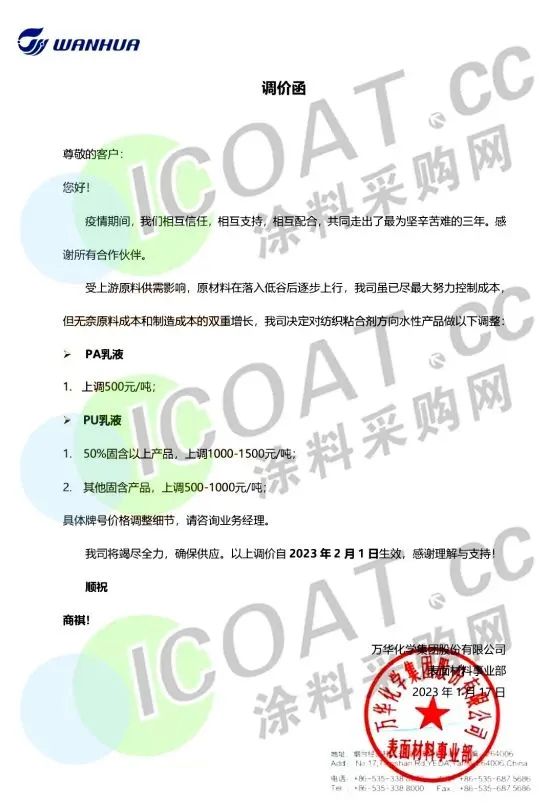 萬華化學(xué):PA乳液上調(diào)500元/噸;PU乳液,50%固含以上產(chǎn)品上調(diào)1000-1500元/噸;其他固含產(chǎn)品上調(diào)500-1000元/噸。