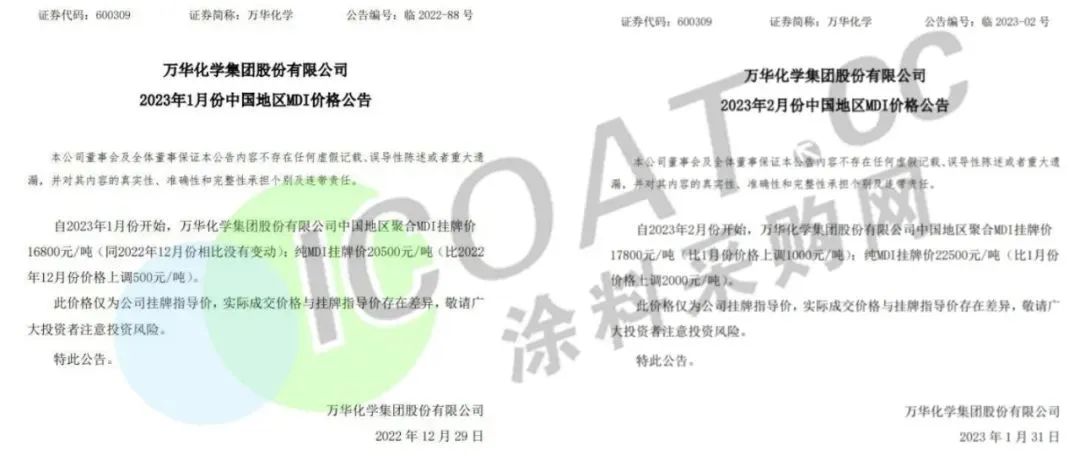 萬華化學(xué):1月份中國(guó)地區(qū)純MDI掛牌價(jià)20500元/噸,比2022年12月份價(jià)格上調(diào)500元/噸;2月中國(guó)地區(qū)聚合MDI掛牌價(jià)17800元/噸,比1月份價(jià)格上調(diào)1000元/噸,純MDI掛牌價(jià)22500元/噸,比1月份價(jià)格上調(diào)2000元/噸。