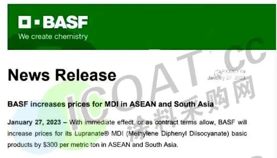 巴斯夫:對(duì)東盟和南亞地區(qū)的MDI基礎(chǔ)產(chǎn)品價(jià)格上漲300美元/噸(約合人民幣2044元/噸)。