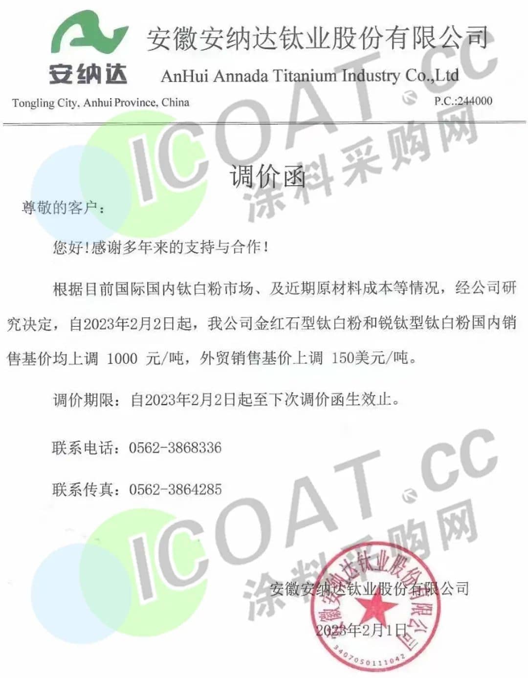 安納達(dá):金紅石型和銳鈦型鈦白粉國(guó)內(nèi)銷售基價(jià)均上調(diào)1000元/噸,外貿(mào)銷售基價(jià)上調(diào)150美元/噸。