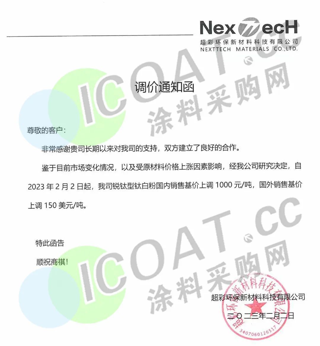 超彩環(huán)保新材料:銳鈦型白粉國(guó)內(nèi)銷售基價(jià)上調(diào)1000元/噸,國(guó)外銷售基價(jià)上調(diào)150美元/噸。
