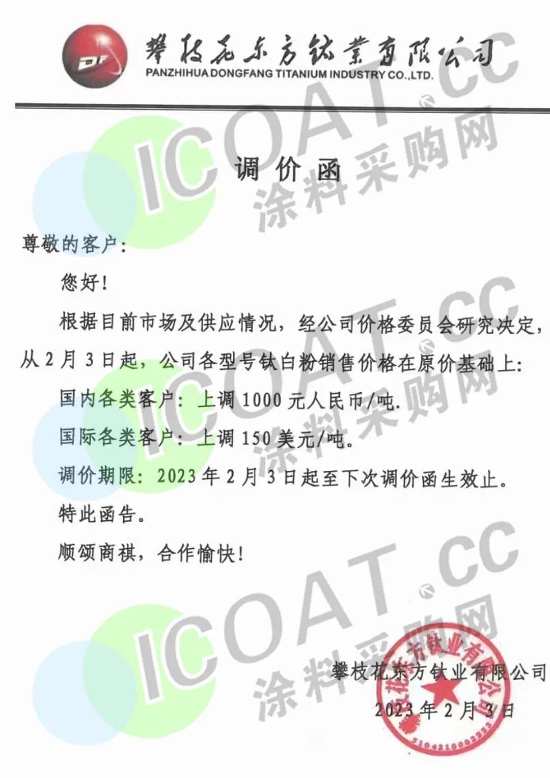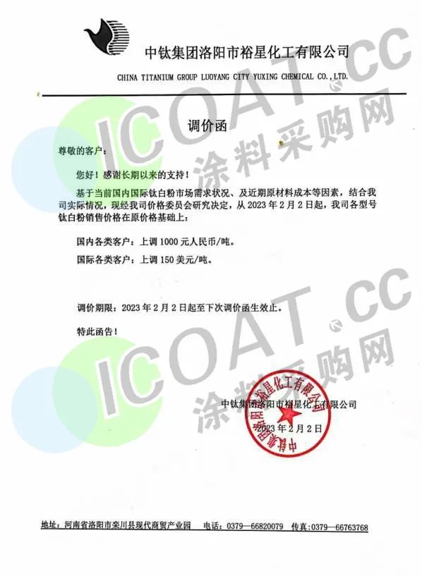 龍佰集團(tuán):各型號(hào)鈦白粉(包括硫酸法鈦白粉、氯化法鈦白粉)銷售價(jià)格在原價(jià)基礎(chǔ)上對(duì)國(guó)內(nèi)各類客戶上調(diào)1000元/噸,對(duì)國(guó)際各類客戶上調(diào)150美元/噸。