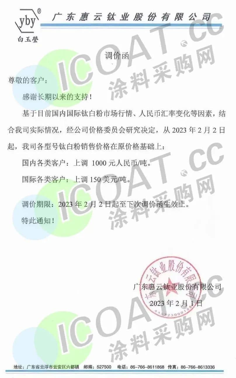 惠云鈦業(yè):各型號(hào)鈦白粉銷售價(jià)格在原價(jià)格基礎(chǔ)上:國(guó)內(nèi)各類客戶上調(diào)1000元/噸,國(guó)際各類客戶上調(diào)150美元/噸。