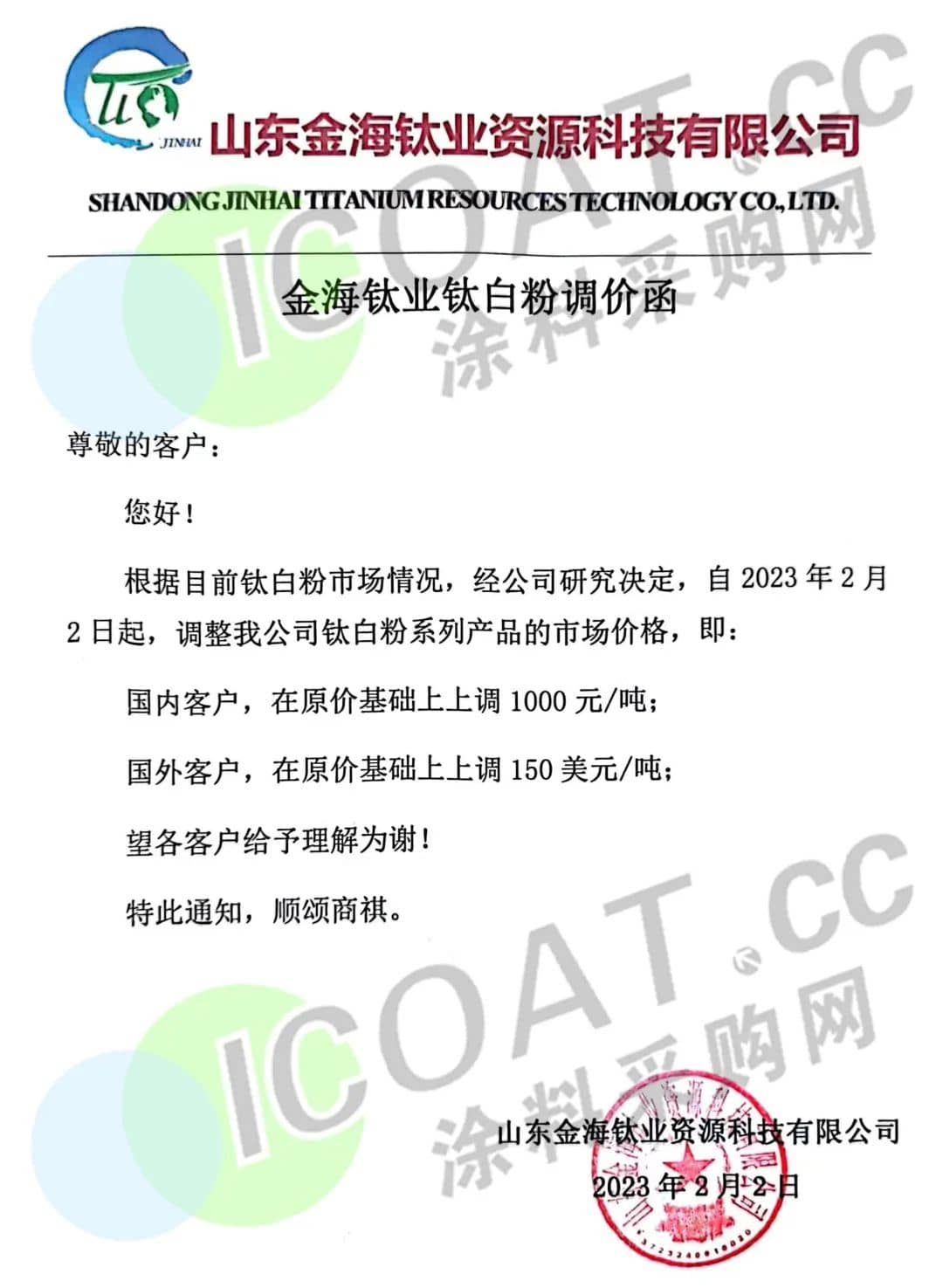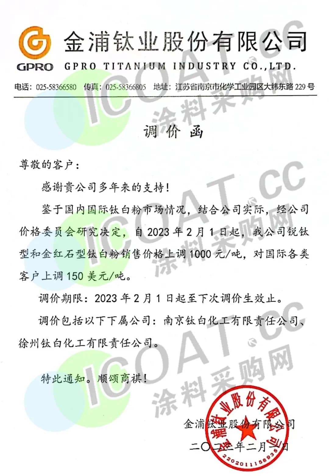 金浦鈦業(yè):銳鈦型和金紅石型鈦白粉銷售價(jià)格上調(diào)1000元/噸,對(duì)國(guó)際各類客戶上調(diào)150美元/噸。