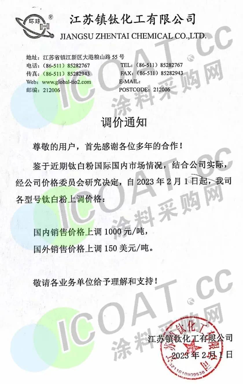江蘇鎮(zhèn)鈦化工:各型號(hào)鈦白粉上調(diào)價(jià)格:國(guó)內(nèi)銷售價(jià)格上調(diào)1000元/噸,國(guó)外銷售價(jià)格上調(diào)150美元/噸。