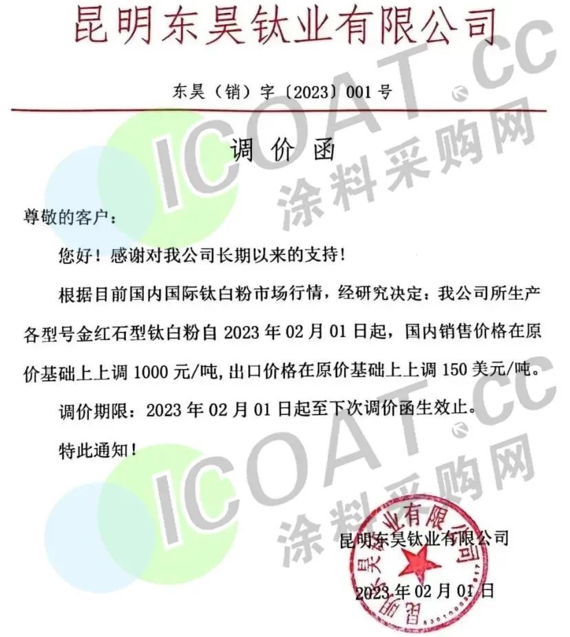 昆明東昊鈦業(yè):國(guó)內(nèi)銷售價(jià)格在原價(jià)基礎(chǔ)上上調(diào)1000元/噸,出口價(jià)格在原價(jià)基礎(chǔ)上上調(diào)150美元/噸。