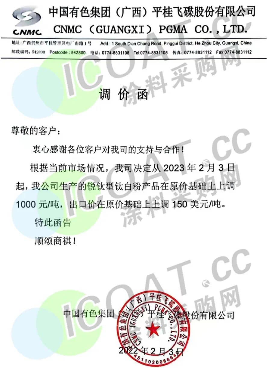 平桂飛碟:銳鈦型鈦白粉產(chǎn)品在原價(jià)基礎(chǔ)上上調(diào)1000元/噸,出口價(jià)在原價(jià)基礎(chǔ)上上調(diào)150美元/噸。