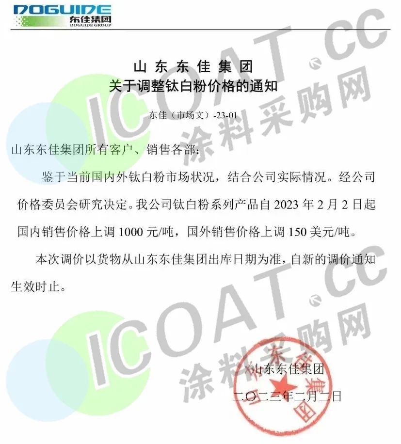 山東東佳:鈦白粉系列產(chǎn)品國(guó)內(nèi)銷售價(jià)格上調(diào)1000元/噸,國(guó)外銷售價(jià)格上調(diào)150美元/噸。