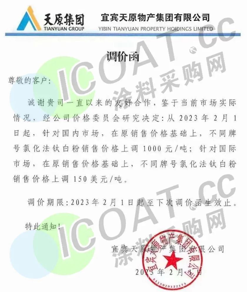 天原集團(tuán):不同牌號(hào)氯化法鈦白粉,國(guó)內(nèi)市場(chǎng)銷售價(jià)格上調(diào)1000元/噸;國(guó)際市場(chǎng)銷售價(jià)格上調(diào)150美元/噸。