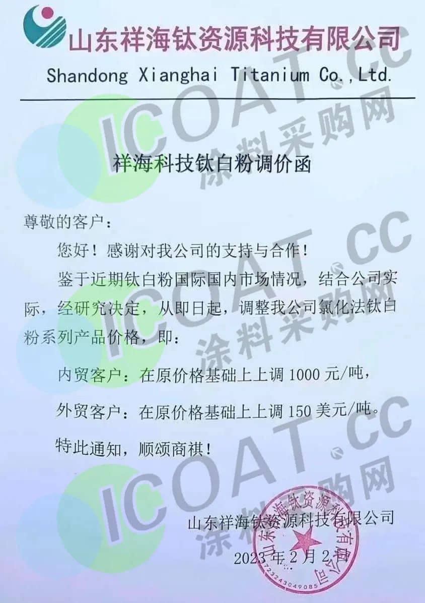 祥海科技:氯化法鈦白粉系列產(chǎn)品內(nèi)貿(mào)客戶在原價(jià)格基礎(chǔ)上上調(diào)1000元/噸,外貿(mào)客戶在原價(jià)格基礎(chǔ)上上調(diào)150美元/噸。