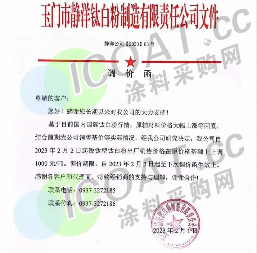 玉門市靜洋鈦白:銳鈦型鈦白粉出廠銷售價(jià)格在原價(jià)格基礎(chǔ)上上調(diào)1000元/噸。