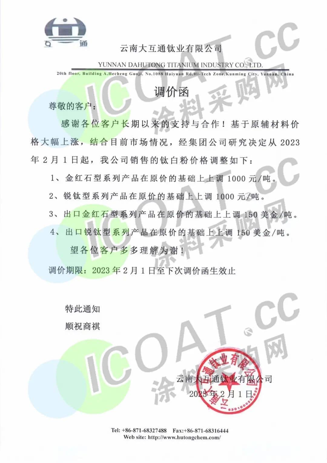 云南大互通鈦業(yè):金紅石型、銳鈦系列產(chǎn)品在原價(jià)的基礎(chǔ)上上調(diào)1000元/噸,出口金紅石型、銳鈦型系列產(chǎn)品在原價(jià)的基礎(chǔ)上上調(diào)150美元/噸。