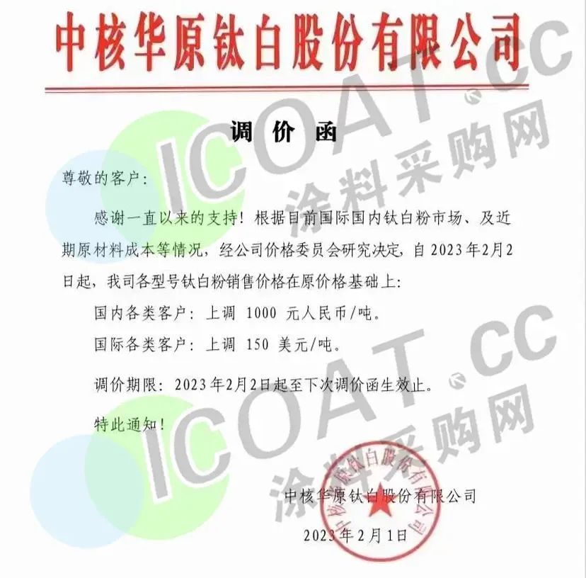 中核華原鈦白:各型號(hào)鈦白粉銷售價(jià)格在原價(jià)格基礎(chǔ)上:國(guó)內(nèi)各類客戶上調(diào)1000元/噸,國(guó)際各類客戶上調(diào)150美元/噸。