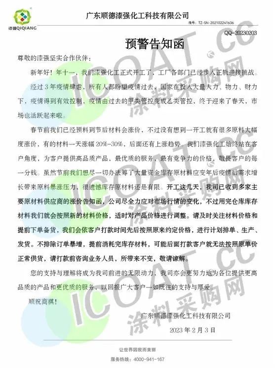 可樂麗、利華益、華魯恒升等化工企業(yè)的產(chǎn)品也出現(xiàn)了部分調(diào)漲的情況,據(jù)涂料采購(gòu)網(wǎng)不完全統(tǒng)計(jì),春節(jié)之后,已有40多家化工企業(yè)發(fā)函宣布漲價(jià),未發(fā)函的企業(yè)也已經(jīng)陸續(xù)通知了客戶群體,進(jìn)行不同程度的價(jià)格上漲,一單一議、實(shí)單商談?wù)吒瞧毡椋苛袭a(chǎn)業(yè)也受到了相應(yīng)的影響。廣東順德漆強(qiáng)化工稱,開工幾天就已經(jīng)收到多家原材料供應(yīng)商的漲價(jià)函,多數(shù)原料大幅漲價(jià),并表示用完庫存材料企業(yè)就會(huì)適時(shí)對(duì)產(chǎn)品價(jià)格進(jìn)行調(diào)整。