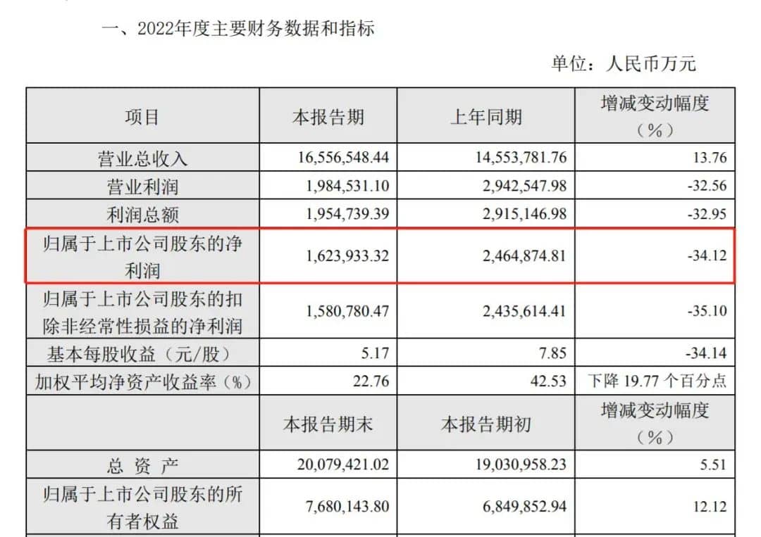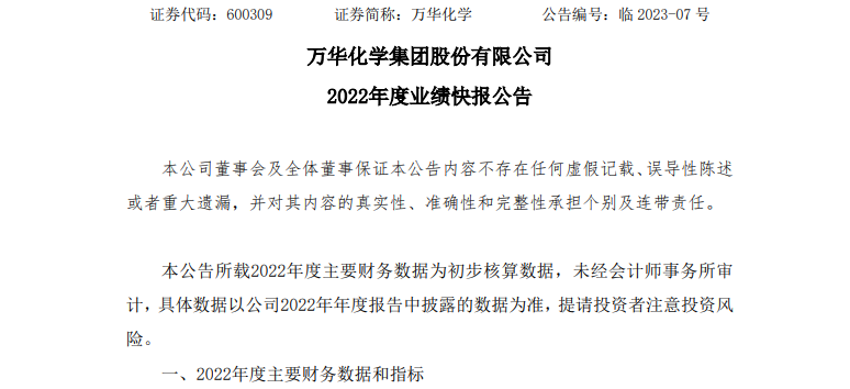 作為化工行業龍頭,市值超3000億的萬華化學(以下簡稱:“公司”)2022年聚氨酯、石化以及精細化學品等主要產品產銷量均同比增長,但盈利同比依然出現了顯著下滑。萬華化學發布2022年業績快報顯示,報告期內該公司營業收入預計為1655.65億元,同比增長13.76%;凈利潤預計為162.39億元,同比下降34.12%;基本每股收益5.17元,較上年同期的7.85元下降34.14%。