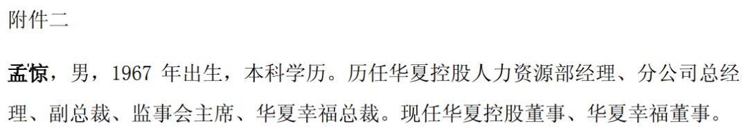 孟驚曾任華夏控股人力資源部經理、分公司總經理,2013年任副總裁,到2014年升任為總裁。