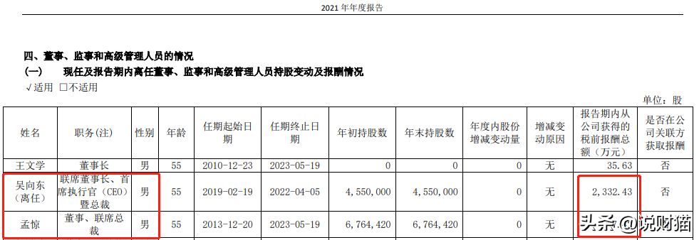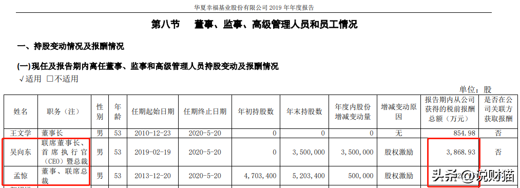 到2019年時,孟驚的總報酬有2021萬元,而空降的吳向東,當年的報酬達到3869萬元。
