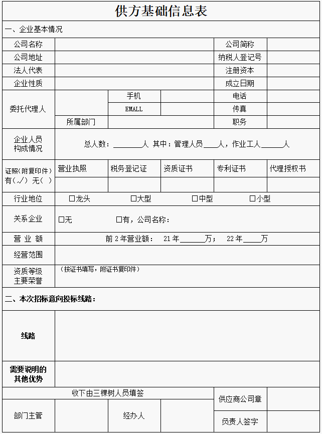 1、蓋有企業公章的授權書、企業法人代表身份證明書、供方基礎信息表、供應商信息匯總表,詳見以下附件。