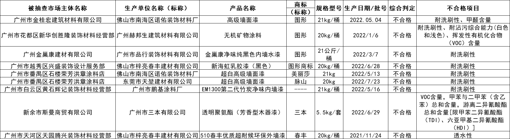 近日,廣州市市場監督管理局公布了多個品類的涂料產品抽檢結果。