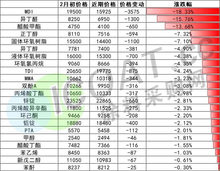 固體環氧市場,黃山錦峰周內跌價500元/噸,安徽美佳、巴陵石化、黃山五環、黃山天馬、陽信科瑞、黃山永利周內跌價300元/噸,黃山恒遠周內跌價200元/噸;液體環氧市場,巴陵石化周內跌價1000元/噸,濟南天茂周內跌價500元/噸,南通星辰、珠海宏昌周內跌價300元/噸。