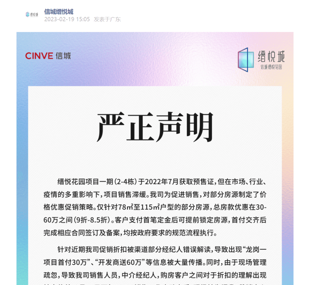當地住建局第二天迅速查處了這個樓盤,給出的原因是:擾亂市場。按照深圳市的規定,開發商在售賣新房產品的時候,售價不能高于或者低于備案價的15%(即售價的最低折扣為85折)。總價300萬元的房產優惠60萬元,相當于打了8折,優惠幅度太大,前期以較小優惠買房的購房者則會產生心理不平衡。