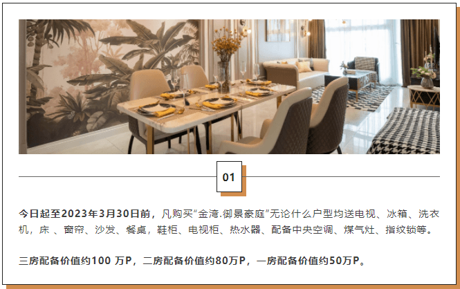 凡購買“金灣·御景豪庭”無論什么戶型均送電視、冰箱、洗衣機、床、窗簾、沙發、餐桌、鞋柜、電視柜、熱水器、配備中央空調、燃氣灶、指紋鎖等。