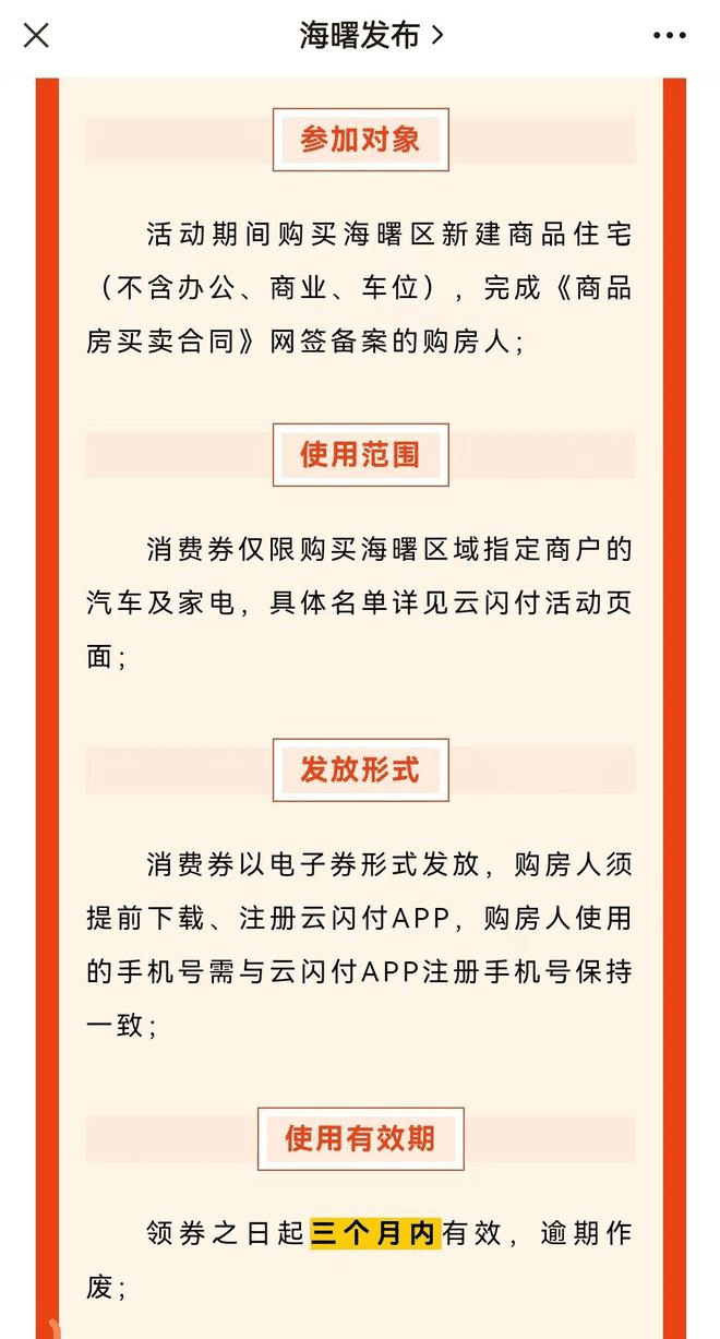 浙江省寧波市海曙區首次推出千萬購房消費券,購買海曙區新建商品住宅(不含辦公、商業、車位),完成《商品房買賣合同》網簽備案的購房人,房價在300萬元以內的可獲10萬元消費券,300萬-500萬元的送15萬元,500萬元以上的送18萬元。購房者憑券在海曙區指定商家購買汽車、家電,三個月內有效。