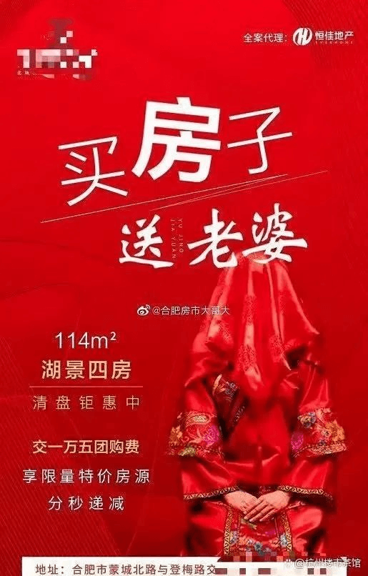 恒桂地產推出交一萬五團購費享限量特價房源活動,還打出了“買房子送老婆”的宣傳語。