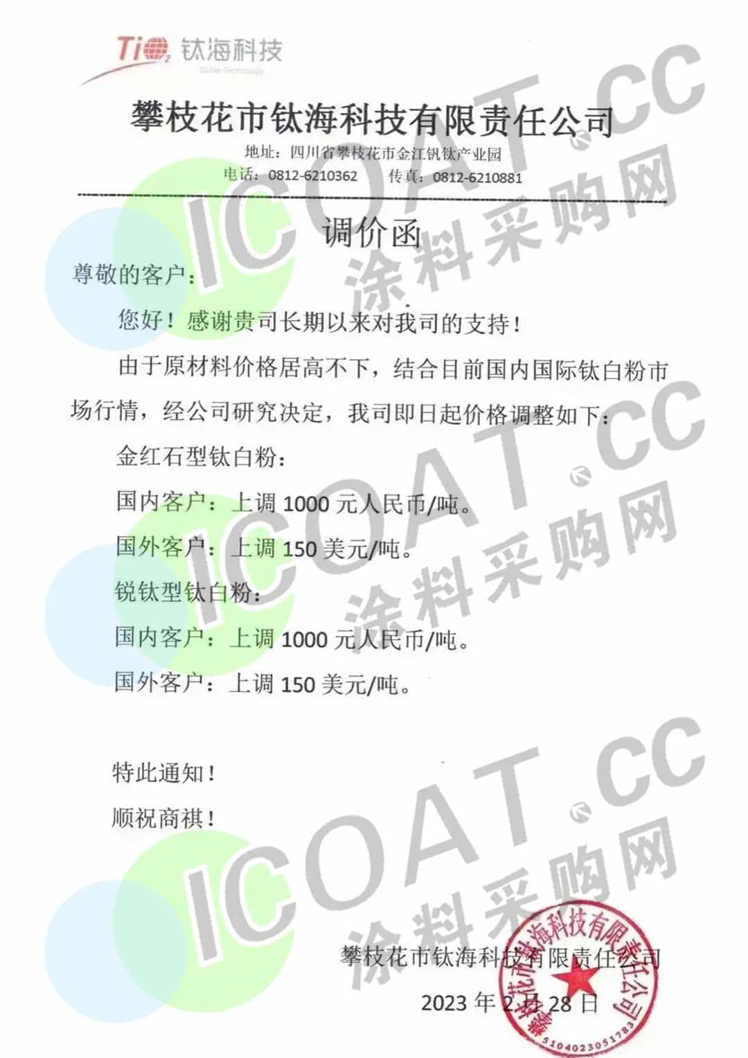 同日,攀枝花市鈦海科技發布調價函,稱由于原材料價格居高不下,經研究決定,即日起金紅石型、銳鈦型鈦白粉國內客戶上調1000元/噸,國外客戶上調150美元/噸。